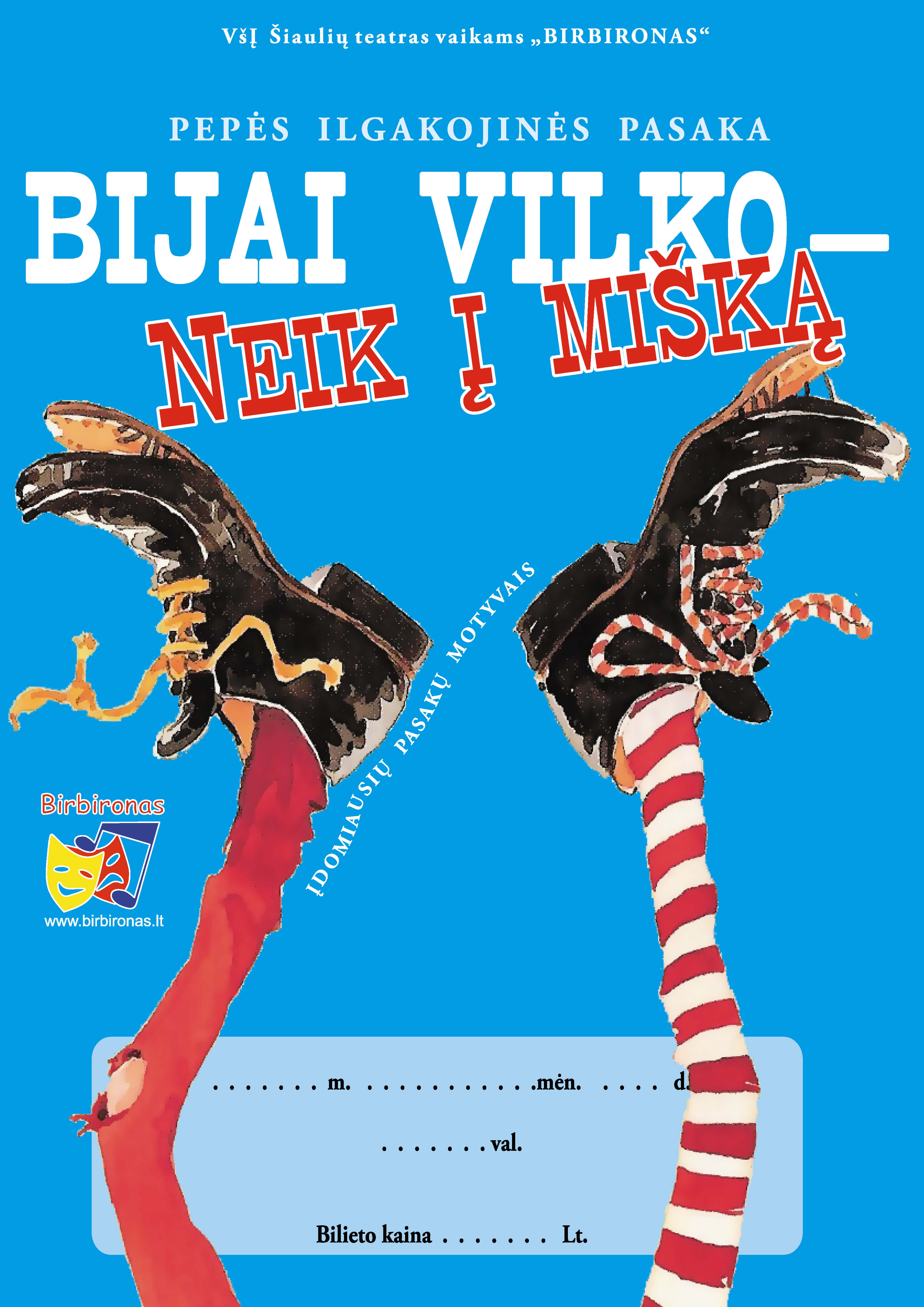Šiaulių teatras vaikams BIRBIRONAS mažuosius žiūrovus kviečia smagiai paminėti Teatro dieną!Kovo 17 d. (ketvirtadienį) 11 val. Šiaulių kultūros centre (Aušros al. 31) bus rodomas nuotaikingas spektaklis „Bijai vilko – neik į mišką“. Pagrindinė veikėja Pepė Ilgakojinė kartu su draugais Anika ir Tomiu pasakoja populiariausias pasakas, kuriose nuolat pasirodo vilkas, tad vaikai nusprendžia vilką pamokyti. Kaip Pepė vilką mokė, pamatysite spektaklyje. Žiūrovai taip pat nebus pasyvūs žiūrovai, jie įsitrauks į spektaklio veiksmą, o keli išrinktieji turės galimybę net patys pabūti aktoriais.